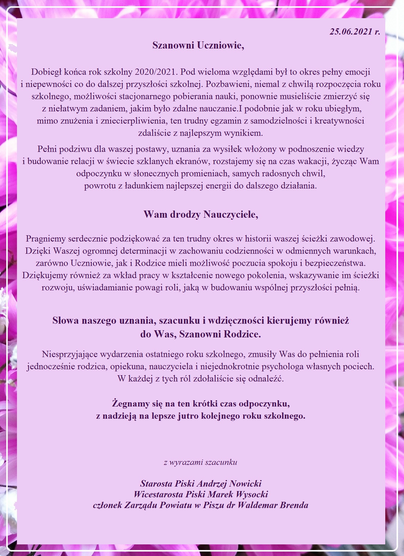 Koniec roku szkolnego 2020/2021 | Starostwo Powiatowe w Piszu