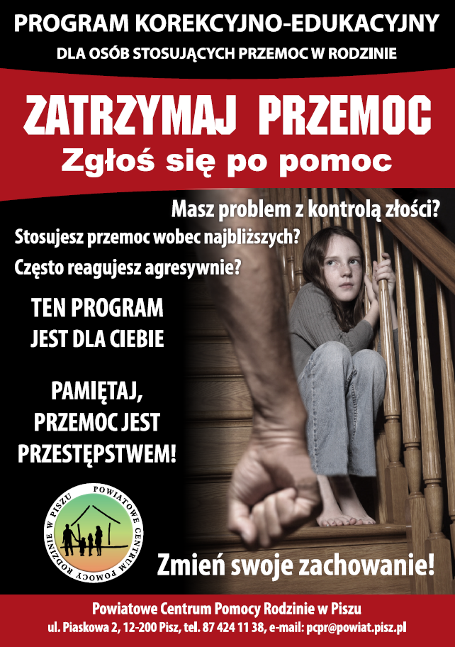 Powiatowe Centrum Pomocy Rodzinie w Piszu informuje, że w ramach Krajowego Programu Przeciwdziałania Przemocy w Rodzinie realizuje koleją edycję Programu korekcyjno-edukacyjnego dla osób stosujących przemoc w rodzinie.